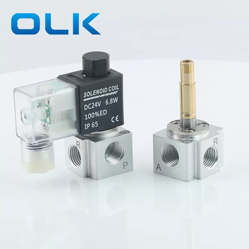 OLK markako 3V2 solenoide balbula honek ondo funtzionatzen du fluxu ertaineko aire kontrolatzeko. Azkar aldatzen da, potentzia gutxi erabiltzen du eta denbora luzez irauten du. Normalean itxita (NC), normalean irekia (NO) edo solenoide bikoitza izan daiteke. Askotan erabiltzen da automatizazio-lerroetan, ontziratzeko makinetan, inprimatzeko makinetan eta janari-makinetan. Bere tamaina txikiak leku estuetarako aproposa da.