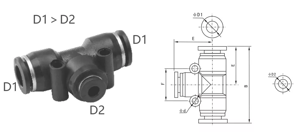 Peg Seriea Tee Union Union-a egokitzen da, D2 baino D2 handiagoa da, diametro desberdinetako hodiak konektatzeko eta adar-hodiak lotzeko diseinatua. Tee Union Tee Union the theping muntatzeko zulo txiki bat da, ekipamendu edo paneletan instalazio erraz eta segurua lortzeko, instalazio espazioa aurreztuz.