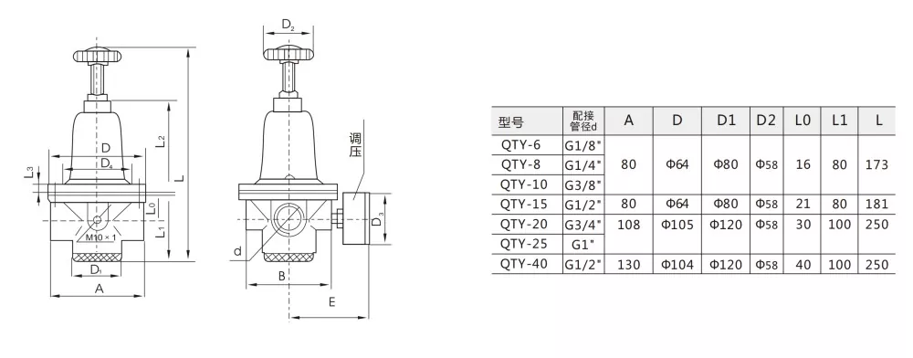 QTY presio erregulatzaileak sistema pneumatikoetako airearen presioa kontrolatzen du. Aire konprimiturako egokia, zazpi tamainako ataka eskaintzen du. Erregulagailuak SARRERA eta OUT-A aire-fluxuaren markak ditu; jarraitu beti ihesak saihesteko. Doikuntza errazak irteera egonkorra eta fidagarria bermatzen du.