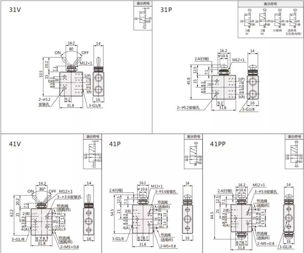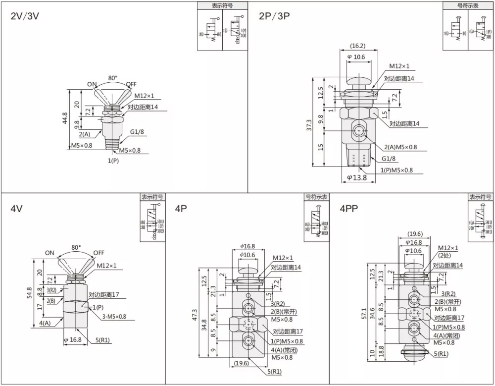 TAC serieak 2 posizioa 2 modu, 2 posizioa 3 modu eta 2 posizioa 5 modu aukeratu daiteke. Palanka mota eta bi mota bi haria: M5, G1 / 8.